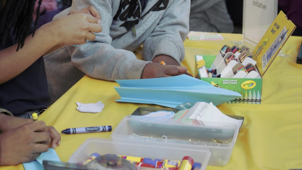 Perfectly consistent with VOCM’s “West Jackson: Changing the Narrative” initiative our student’s hands on ‘experiment’ involved learning about flight through creating and modifying paper airplanes. Pictured here (sitting center facing the camera) Ms. Debra Raddin is instructing students on the basic steps of making a paper airplane. Ms. Raddin interspersed her instructions with pertinent and thought provoking questions about how planes fly and presented options the students could use to first construct their airplanes and afterward to change the design of their airplane to try to make it fly better. Throughout Ms. Raddin’s time with the students she kept her narrative age appropriate to the group she was speaking with. Students had their choice of 12 different materials they could use to construct their airplanes. As test pilots they flew their airplanes through a Hula-A-Hoop that was suspended 3 feet above the ground. After their maiden test flight and the student’s observations of how successful the test flight was the conversation with them centered on the engineering process of: